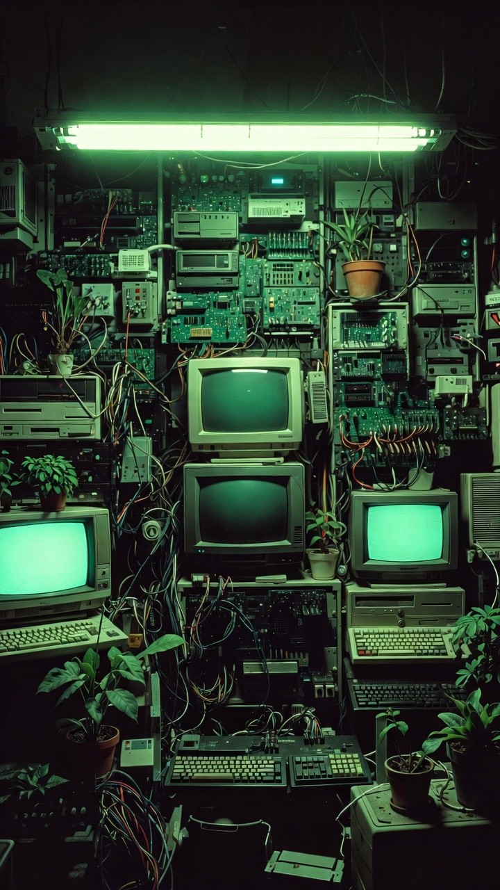 A complex vertical shot reveals a dense, floor-to-ceiling wall of vintage computer hardware, CRT monitors, and exposed circuit boards. A bright green fluorescent light at the top bathes the entire scene in a monochromatic emerald glow. Interspersed among the keyboards and tangled wires are several small potted plants, their green leaves blending with the electronic components to create a "nature reclaiming technology" aesthetic. The composition is highly detailed, featuring multiple glowing screens and industrial textures that evoke a gritty, DIY cyberpunk atmosphere.