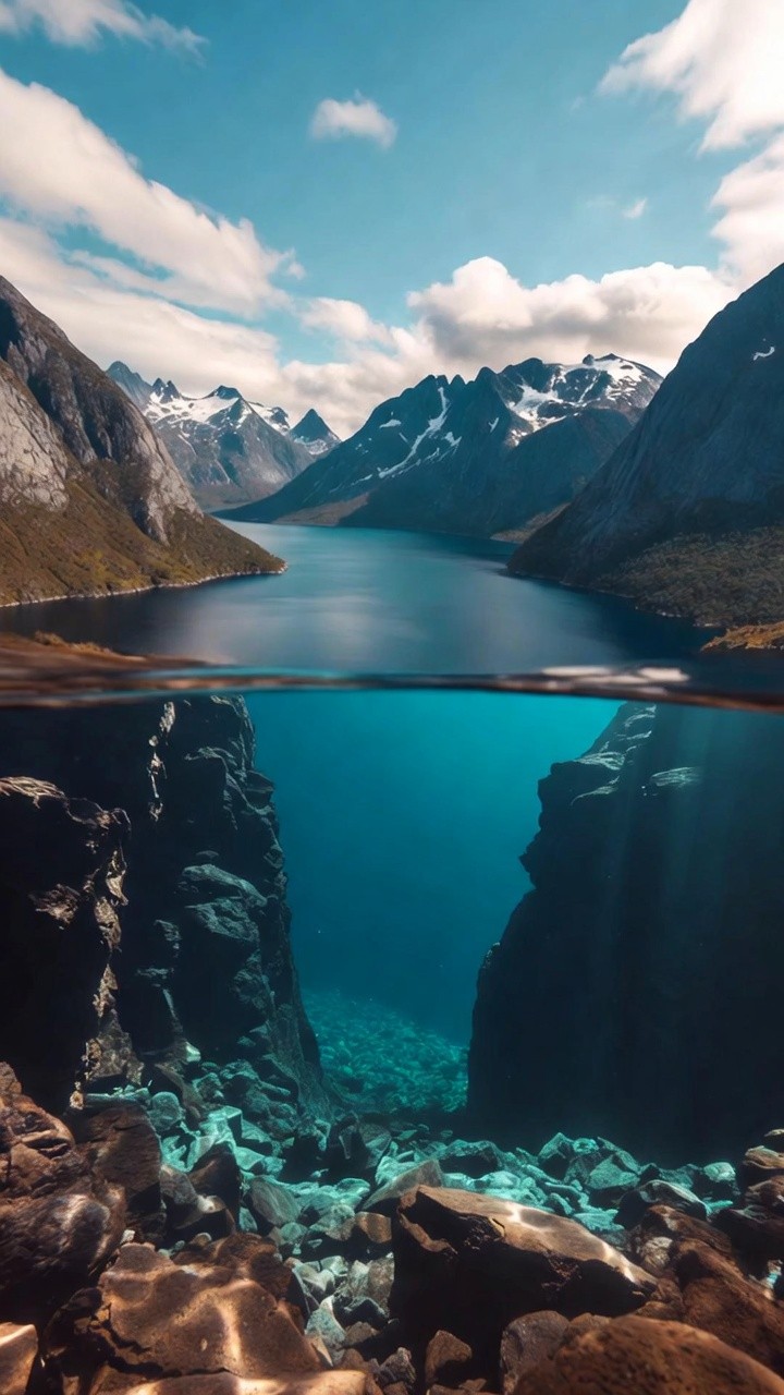 A stunning vertical split-view photograph that captures the dramatic meeting of two worlds. The upper frame showcases a peaceful alpine lake surrounded by steep, snow-dusted mountains under a bright sky filled with soft white clouds. The bottom frame reveals a deep, clear underwater canyon with vertical rock walls and a seabed of textured river stones. Sunlight filters through the water's surface, creating dancing light patterns on the rocks below and emphasizing the incredible clarity and scale of the mountain landscape.