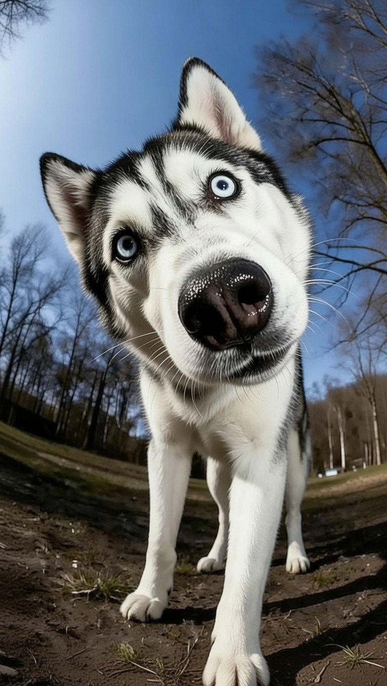 A striking vertical portrait of a Siberian Husky captured with a wide-angle lens, creating a humorous and endearing distorted perspective. The dog's large, dark wet nose dominates the center foreground, while its bright, piercing blue eyes look directly at the viewer with curiosity. The husky features thick black and white fur with characteristic facial markings. The background shows a sunny outdoor environment with bare trees and a clear blue sky, emphasizing the playful and energetic nature of the animal.