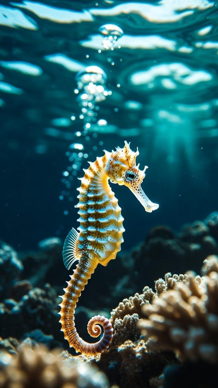Dive into the delicate details of the deep blue! This breathtaking live wallpaper features an ultra-crisp close-up of a golden and white seahorse floating gracefully in crystal-clear ocean water. Framed by a dynamic stream of rising bubbles and a softly blurred coral reef in the background, this mesmerizing aquatic scene offers a deeply calming, highly textured escape for your screen.