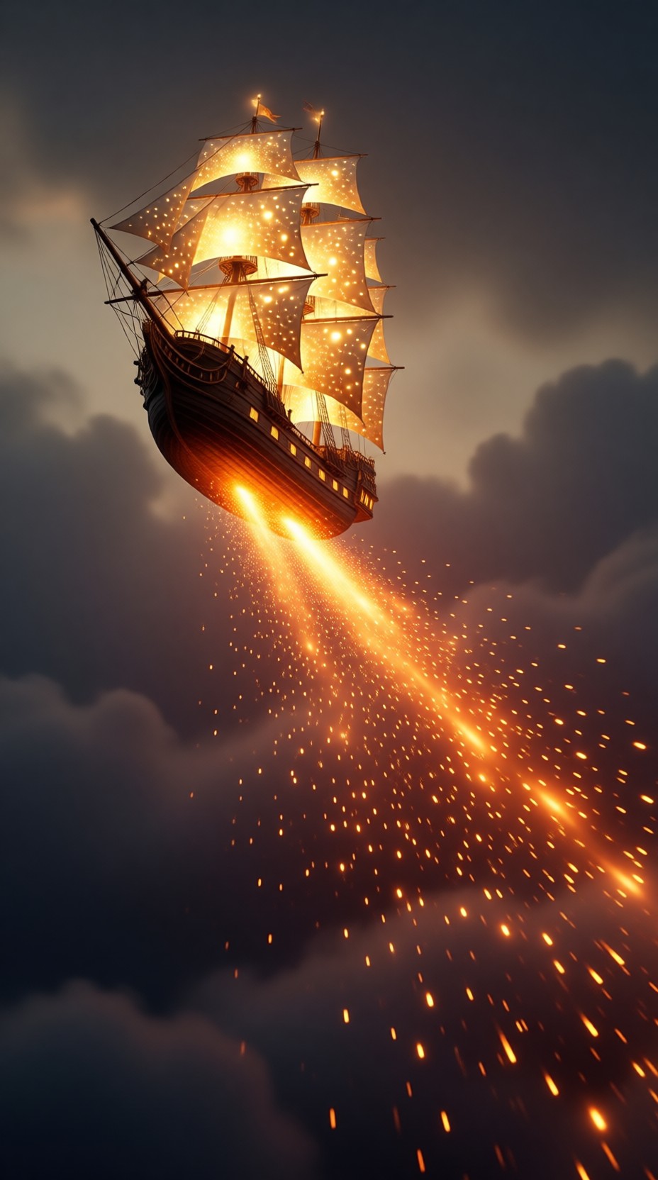 A majestic vertical fantasy scene features a wooden galleon flying through a dark, cloud-filled sky. The ship's many sails are brilliantly illuminated with golden light, appearing to be filled with stars. A powerful stream of bright orange sparks and embers erupts from beneath the hull, acting as a magical engine propelling the ship upward. The contrast between the warm, glowing light of the vessel and the cool, shadowed tones of the surrounding clouds creates a dramatic and epic sense of wonder.